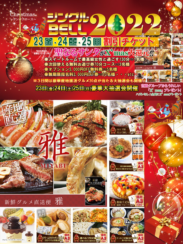 街はクリスマスのイルミネーションに彩られ、流れてくるクリスマスソングが気分を盛り上げてくれます。 その煌びやかな世界に酔いしれ気分はお祭り騒ぎ!! そして期間中 マダム宮殿では地球上最も過激なX’masイベントを贈る!! そうですサンタは実在したのです! この冬、過激なドデカい『サンタクロース』が宮殿に舞い降りる 12月23日(金)・24日(土)・25日(日)の3日間は お客様も!女の子も!お店も!楽しめる 聖なるXmas を盛大に盛り上げていきます♪